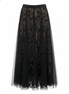 Elevate your wardrobe with this stunning tulle lace skirt, a versatile piece that effortlessly transitions from day to night. The delicate cream and black colour combination creates a sophisticated contrast, while the tulle and lace construction adds texture and movement for a graceful silhouette.